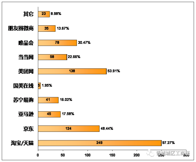 在所有有网购经历的256人中,97.37%的人表示曾在淘宝/天猫购物,淘宝/天猫是居民网购的首选商城。其它较多人购物的商城还有美团网(138人,53.91%)、京东商城(124人、48.44%)、唯品会(78人、30.47%)。值得注意的是,朋友圈微商作为一个新兴的网购渠道,取得了一定程度的信任和发展。