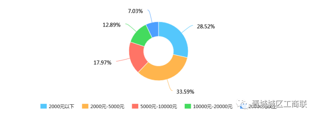 我们调查了被调查者年网络消费情况,年消费20000元以上者有18人,10000元-20000元33人,5000-10000元46人,2000-5000元86人,2000元以下73人,比例如下图。
