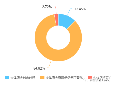 12.45%的居民对实体店持乐观看法,认为实体店将越来越好;84.82%的人认为实体店与过去相比会衰落但是仍无可替代;只有2.72%的人认为实体店终将灭亡。总体来说,消费者对实体零售业依然有很强的信心,实体零售企业也大可不必妄自菲薄,而应该积极创新转型,主动适应互联网时代,释放发展活力。