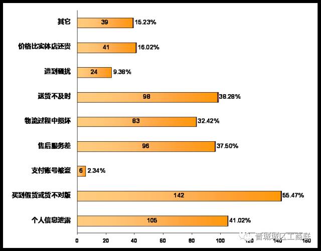 个人信息泄露(41.02%)也是网购中比较严重的一个问题,个人信息与个人财产安全息息相关,如遭到泄露将可能遭遇垃圾短信、骚扰电话、垃圾邮件、诈骗、账户钱款丢失等问题。在调查中,有6位消费者曾出现支付账号被盗的情况,发生率虽不高(2.34%),但一旦发生,损失将是巨大的。