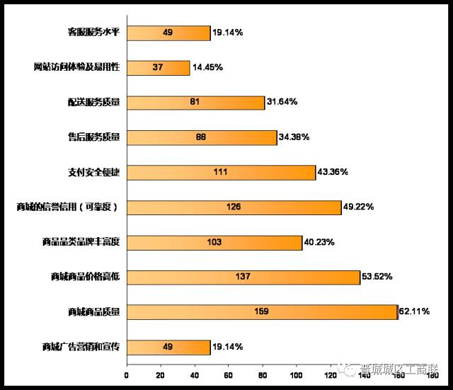 我们针对在网络消费中,最能影响消费者决定的一些因素进行了调查,根据调研结果,我区居民对其关注度如下: